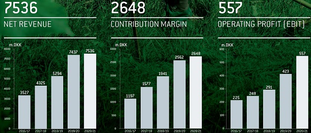 EBIT has risen 31.8% to 557 m.DKK, while the consolidated profit after tax has increased by as much as 53% from 2019/20 to 2020/21.