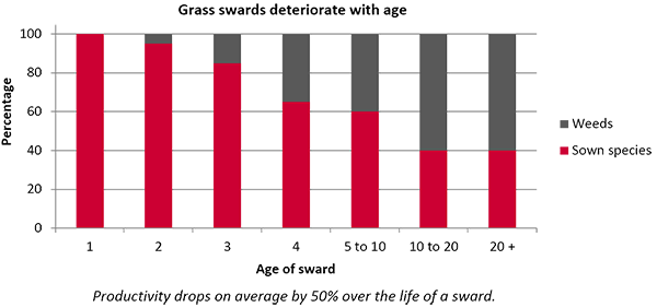 Many factors contribute to the drop in yield. For example, bad weather (too wet, too cold, or too dry) reduces the proportion of perennial ryegrass in a sward. Diseases and pests, such as grubs and mice, cause further damage.