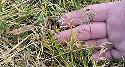 Each dead grass plant creates space for invasive species such as rough meadow grass (Poa trivialis) and annual meadow grass (Poa annua).