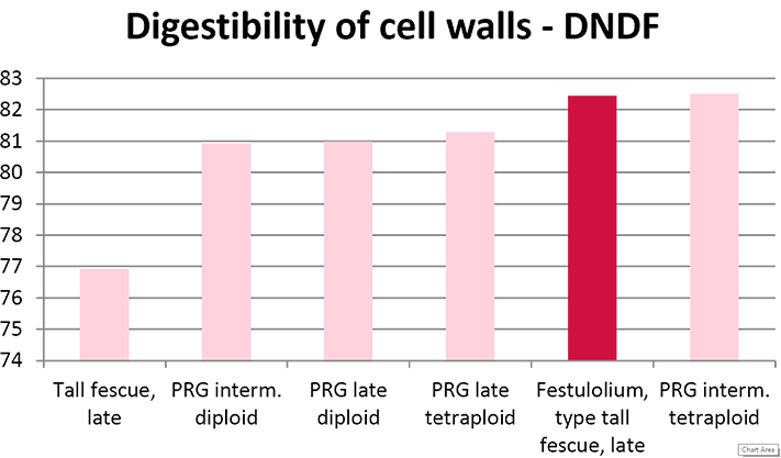 One of the most important criteria when feeding cattle is the digestibility of cell walls, DNDF. The figure below shows that the DNDF level for festulolium, type tall fescue is at the level of perennial ryegrass and around 5% points higher than tall fescue. Research has shown that for each %-point NDF digestibility is increased, the animal forage intake goes up and consequently milk yield increases with around ¼ litres per cow per day.