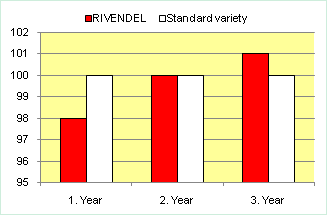 RIVENDEL has a good distribution of DM yields through out the season and years with high rel. yields compared to the standard variety in 3rd. and following years.